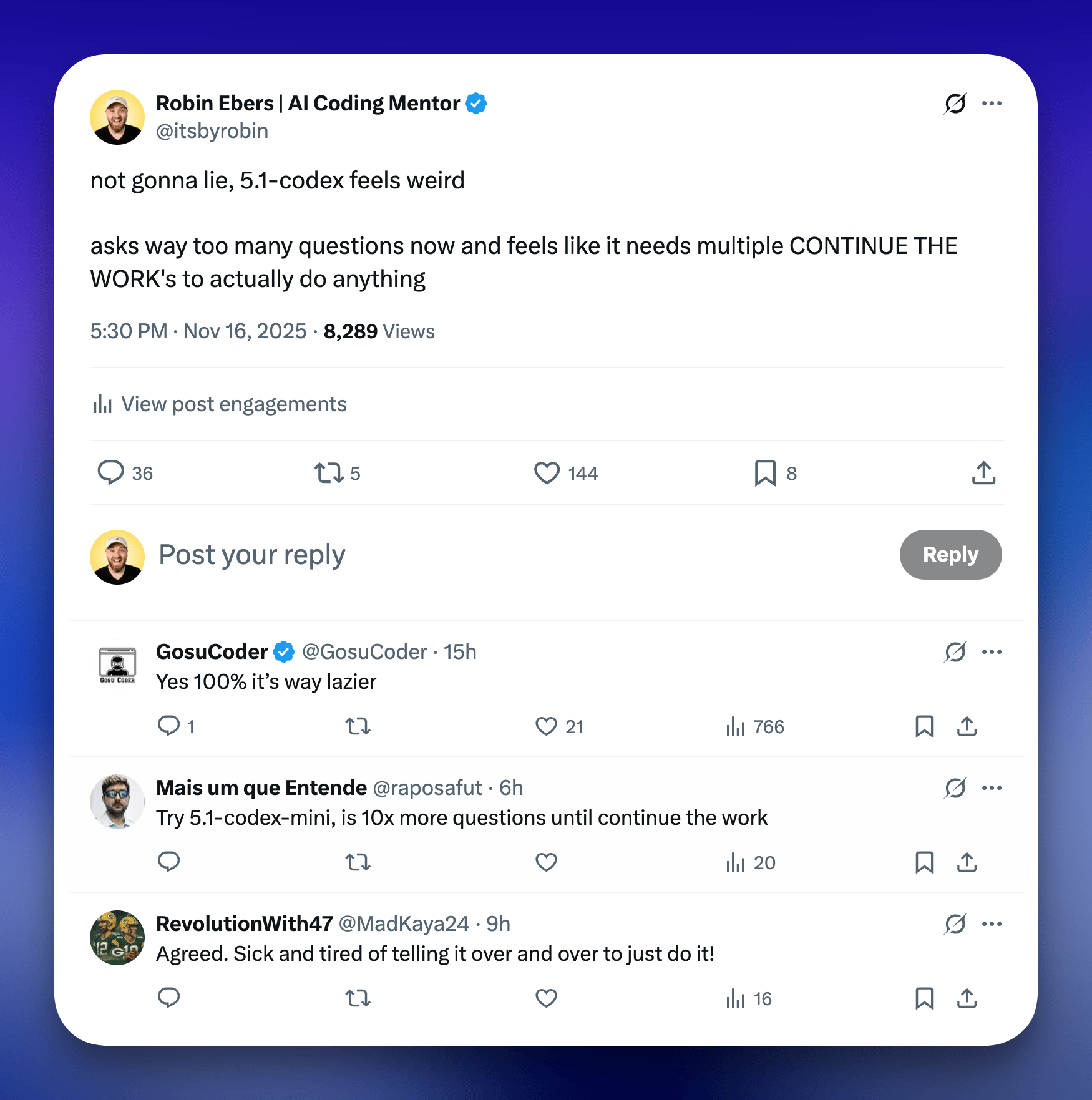 Hey Reader, You can also listen to this episode here. So, GPT-5.1 was released last week and... it feels completely broken. I'm not being dramatic. I spent 6 hours testing it, and something's off. And judging by the 8,200 people who saw my tweet about it... I'm not alone. The Model ExplosionCursor dropped 15 (!) GPT-5.1 models at once. What? GPT-5.1 Fast. GPT-5.1 High Fast. GPT-5.1 Codex Mini. GPT-5.1 Codex Mini High... It's really overwhelming. I stuck with GPT-5.1 Fast and High Fast because I value speed over money. I'd rather pay double and get the job done fast. Here's what I found... GPT-5.1 Is WeirdThe model behaves... differently. Think of it like this: Imagine you hired a developer who keeps asking you "Are you SURE you want me to change that file?" every 2 minutes. That's GPT-5.1. It tells you what it wants to do. Then doesn't do it. Sometimes it straight up refuses, saying "that would be too much work." I'm not making this up. I posted a quick tweet not thinking much about it, and the responses flooded in: "Yes 100% it's way lazier"